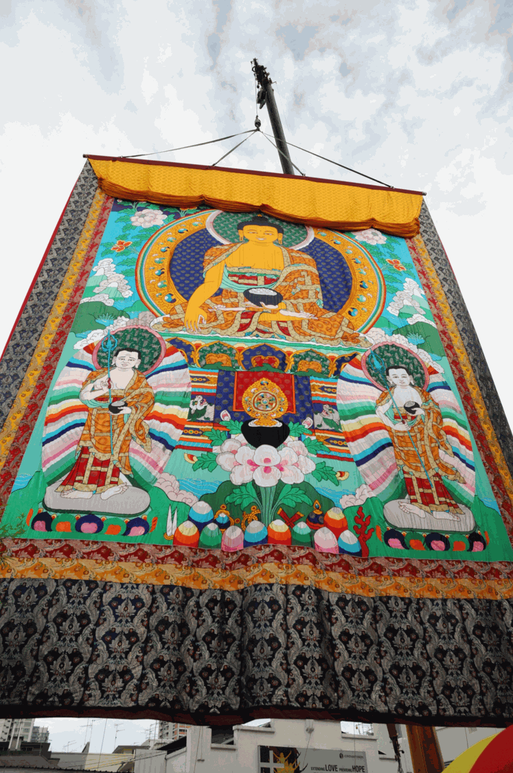 Thekchen Choling is home to a beautiful appliqué thangka depicting Shakyamuni Buddha serenely seated in the full lotus position on a throne, attended to by his two chief disciples Shariputra and Maudgalyayana. It is entirely hand-sewn from silk brocade, beads and sequins. When fully unveiled, the thangka is four storeys tall, making it the largest Shakyamuni Buddha thangka in Southeast Asia.